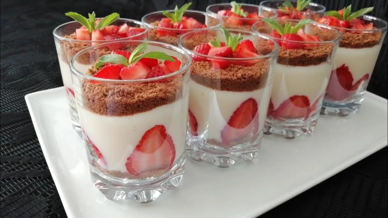- Alt katman için bisküvi kırığı, üzerine vanilyalı muhallebi ve taze çilek dilimleri konulur.