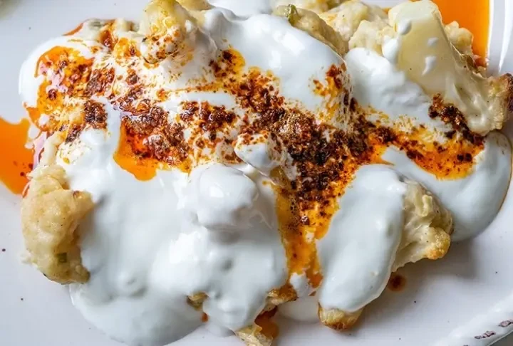 Karnabahar kızartmasının üzerine sarımsaklı yoğurt ve kızdırılmış pul biberli tereyağı dökülür.